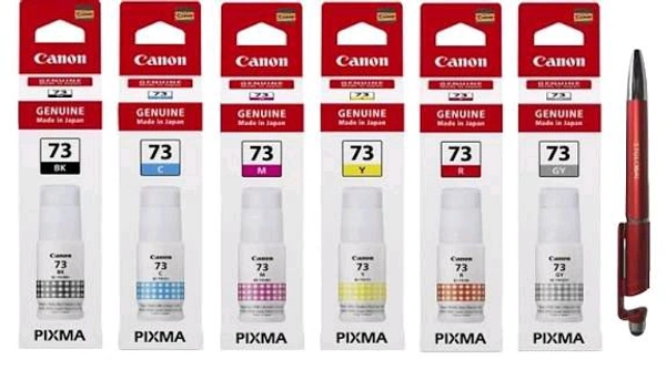 Canon 73 B/C/Y/M/R/GR Ink Bottles with ITGLOBAL 3in1 Multi-Function Mobile Phone Stand, Stylus Pen, Anti-Metal Texture Rotating Ballpoint Pen (Very Colors) GI-73 Gi 73 Gi73